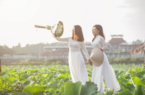 Hai bạn nữ tinh khôi chụp ảnh áo dài bên hoa sen