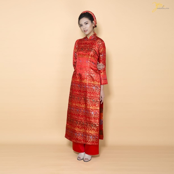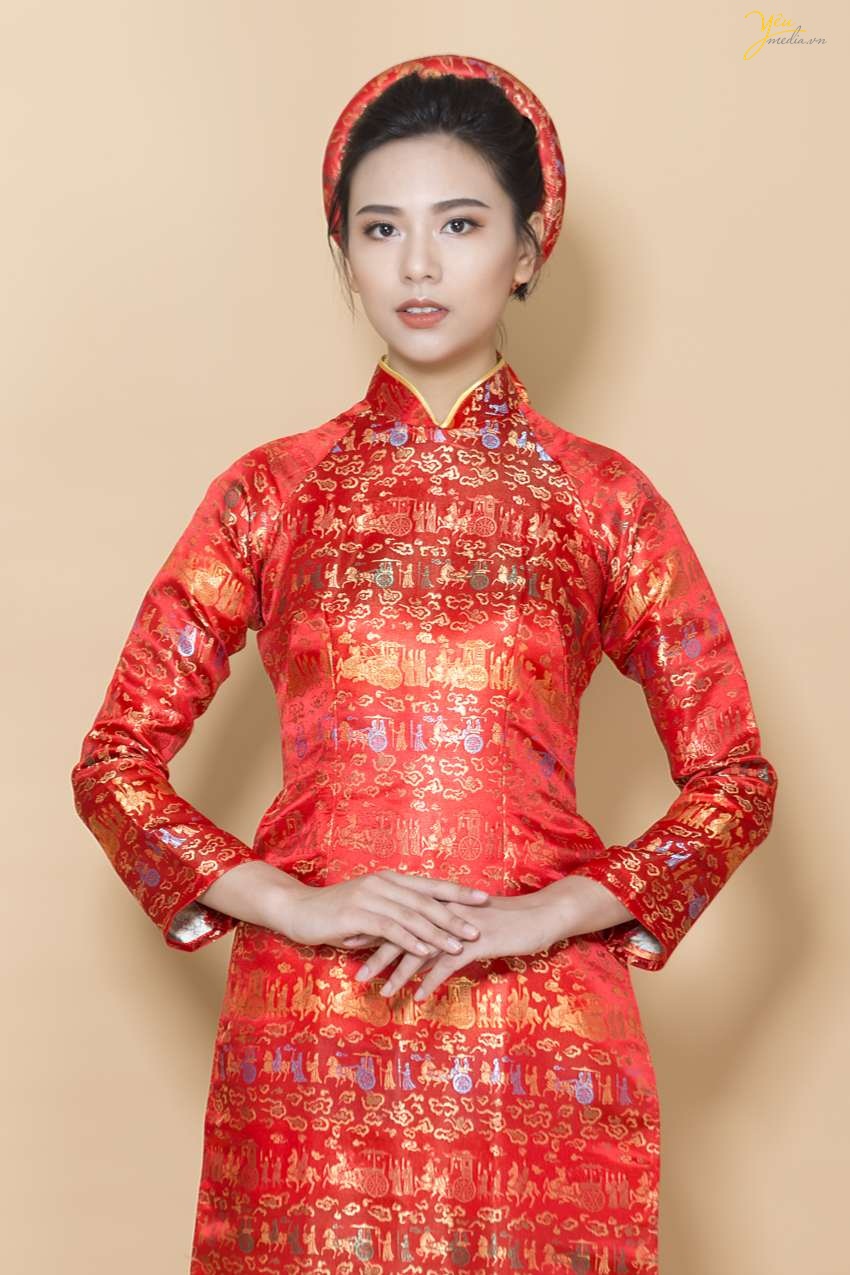 Cùng với váy cưới màu trắng, một bộ áo dài đỏ với phom dáng truyền thống, cổ cao 3 phân, tay dài kín đáo sẽ là trang phục không thể thiếu giúp tôn nét duyên dáng, sang trọng của cô dâu.