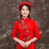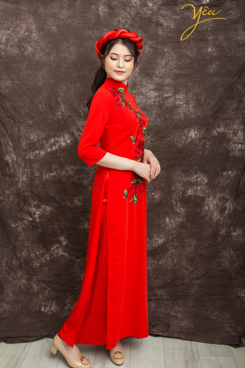 Tà áo dài màu đỏ được tô điểm thêm vẻ đẹp khi thêu hoa xanh và hồng - những họa tiết nhẹ nhàng, càng tôn lên dáng vẻ thanh thoát cho người mặc.
