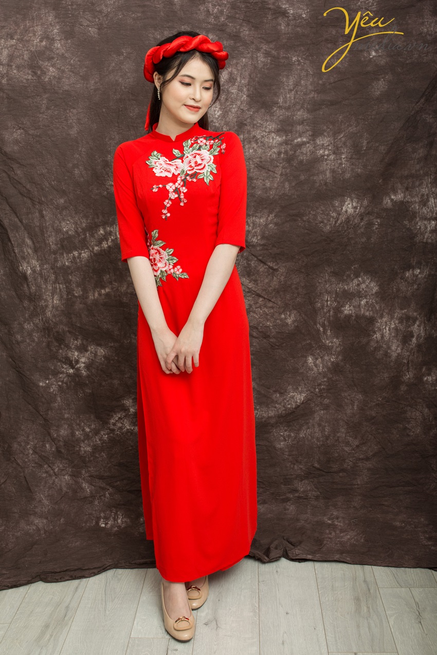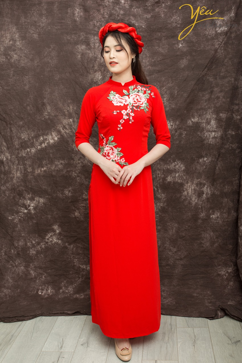 Áo dài màu đỏ là sự lựa chọn của nhiều cô dâu trong dịp ăn hỏi và cưới. Rất nhiều bạn trẻ cũng lựa chọn áo dài để chụp Tết, chụp cùng hoa mai, hoa đào, chụp cùng gia đình và những người thân yêu.