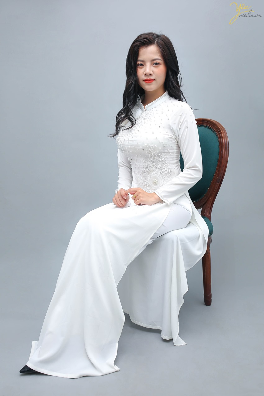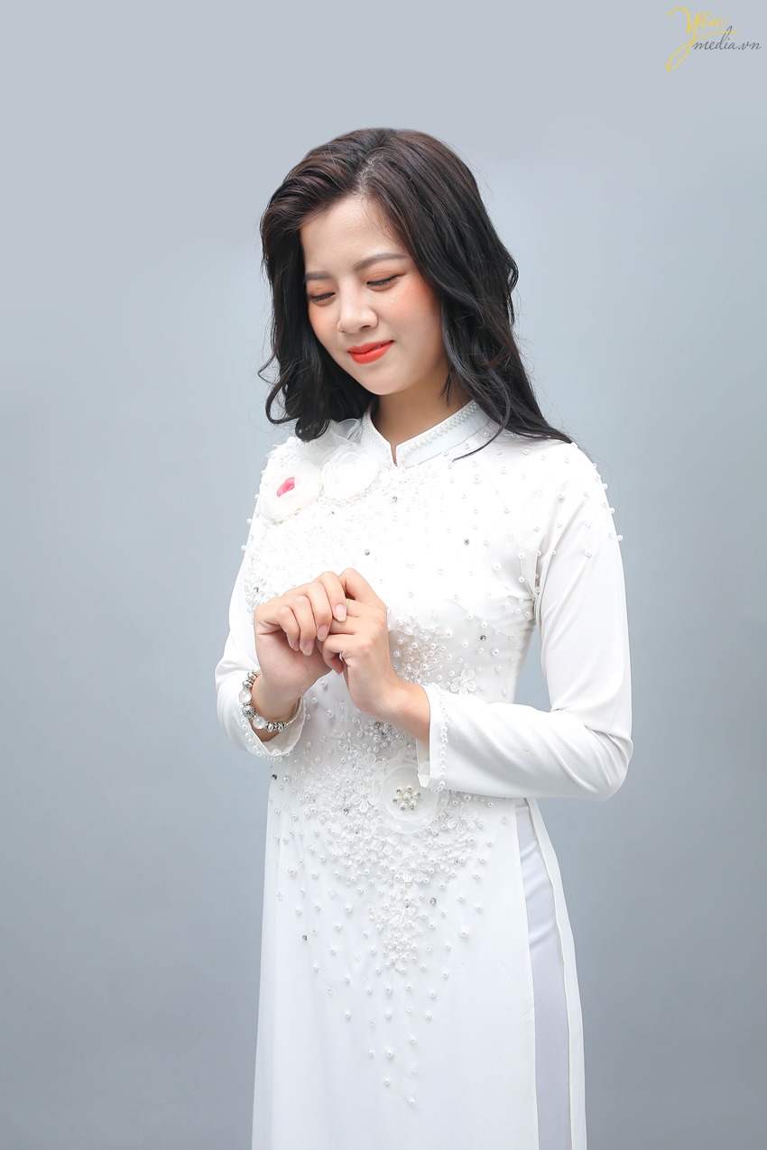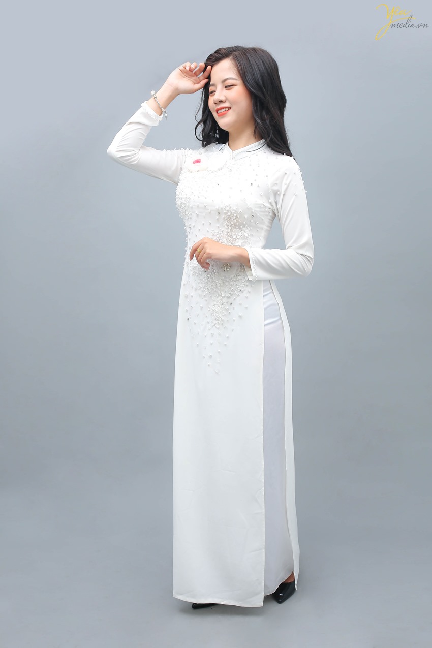 Áo dài trắng chưa bao giờ lỗi mốt. Vẻ đẹp dịu dàng, nền nã của chiếc áo dài trắng, đi cùng với chiếc quần lụa màu trắng luôn là lựa chọn hoàn hảo cho những cô nàng thích vẻ trong sáng. Từng đường nét thiết kế của chiếc áo dài đều được tính toán cẩn thận, hướng tới sự tinh tế. Chiếc cổ tàu nhẹ nhàng, khoe khéo chiếc cổ xinh xắn, giúp tôn được những nét đẹp nhẹ nhàng tiềm ẩn ở mỗi người con gái. Bống hoa được nhấn nhá nhẹ nhàng bên phía ngực trái tạo nên sự nổi bật, nhưng không kém phần tinh tế, quyến rũ. Phía thân trước của áo dài và cổ tay áo cũng có đính những đường ngọc trai hết sức sang trọng và quý phái.