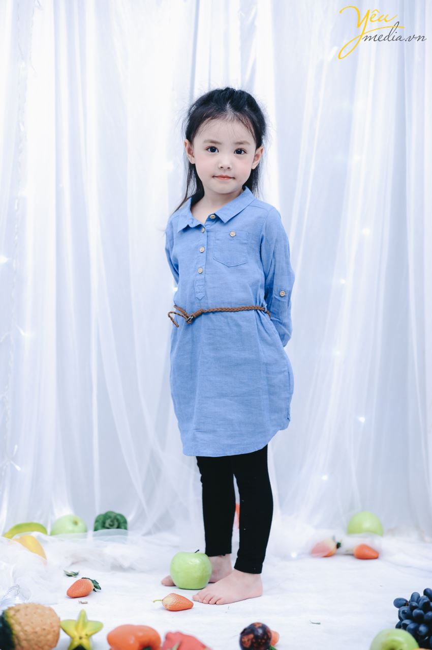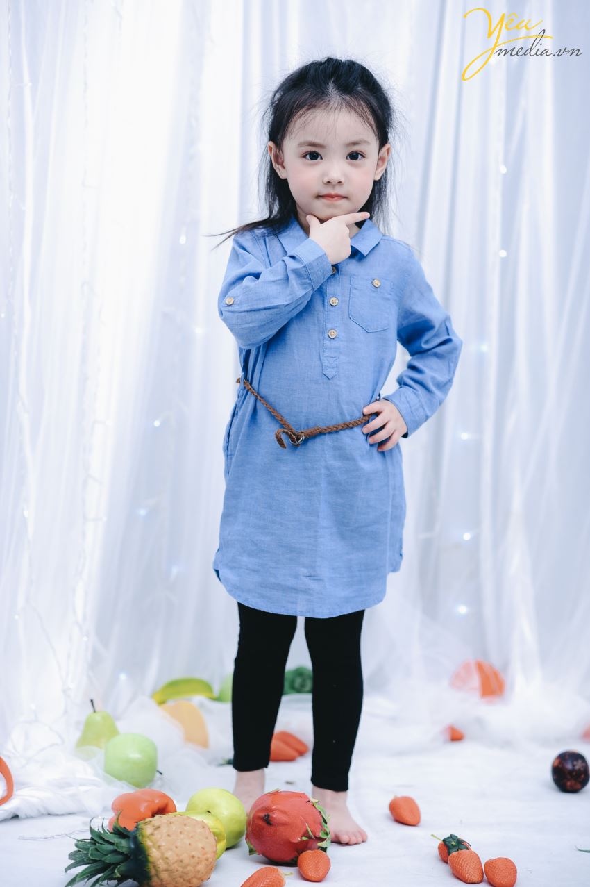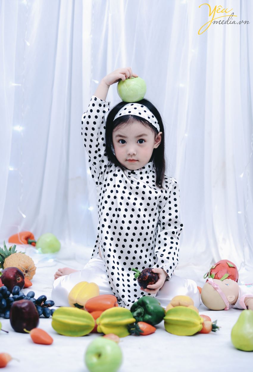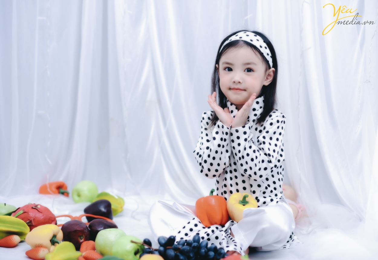 Không chỉ vậy, cả ekip chụp ảnh đều đặc biệt ấn tượng với cách biểu cảm và tạo dáng của cô bé. Sau mỗi lần thay đồ, bé lại chủ động biết tạo dáng để phù hợp với bộ ảnh. Bé cũng biết tương tác với các đạo cụ xung quanh như hoa quả và cành hoa một cách rất “chuyên nghiệp”.