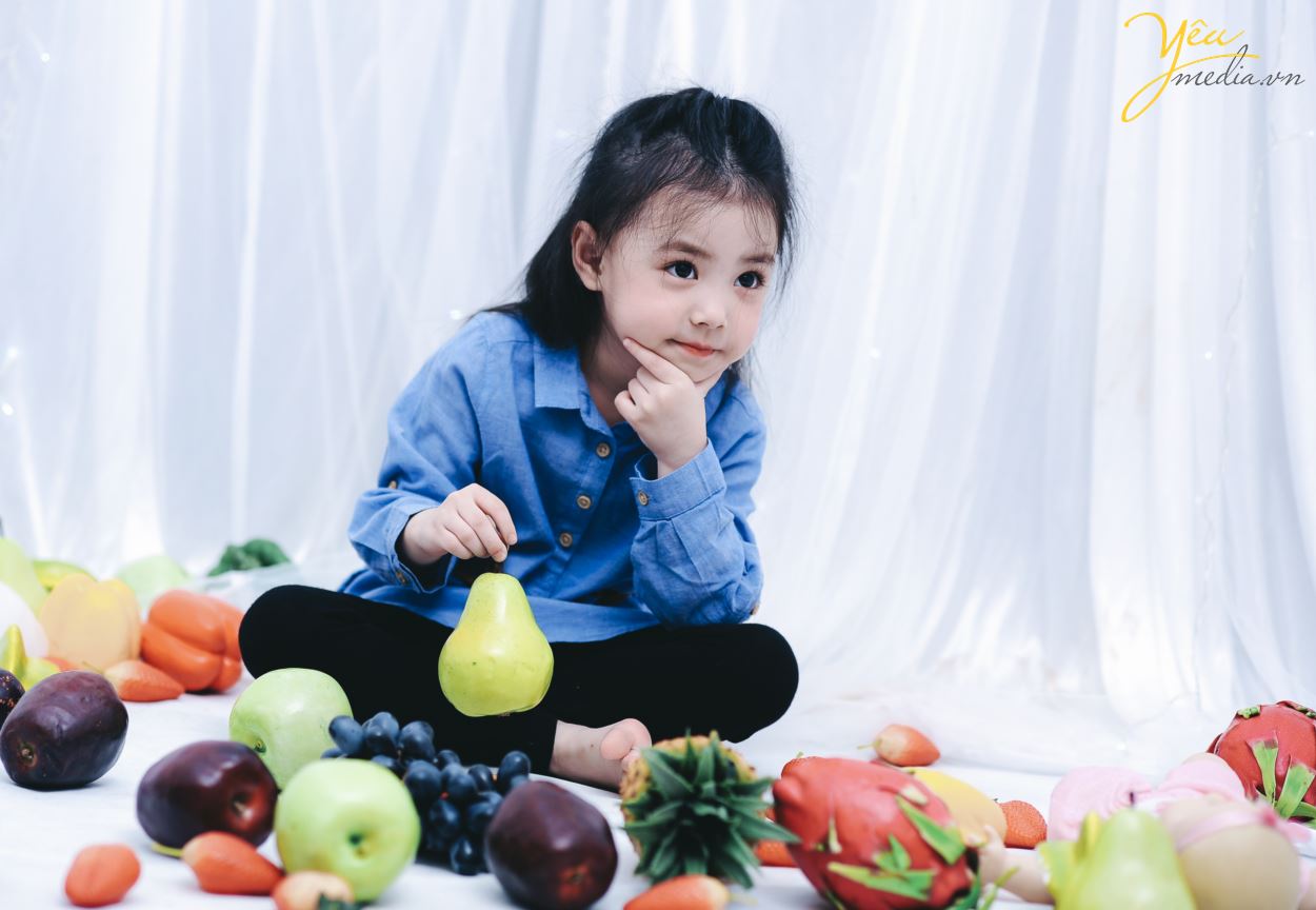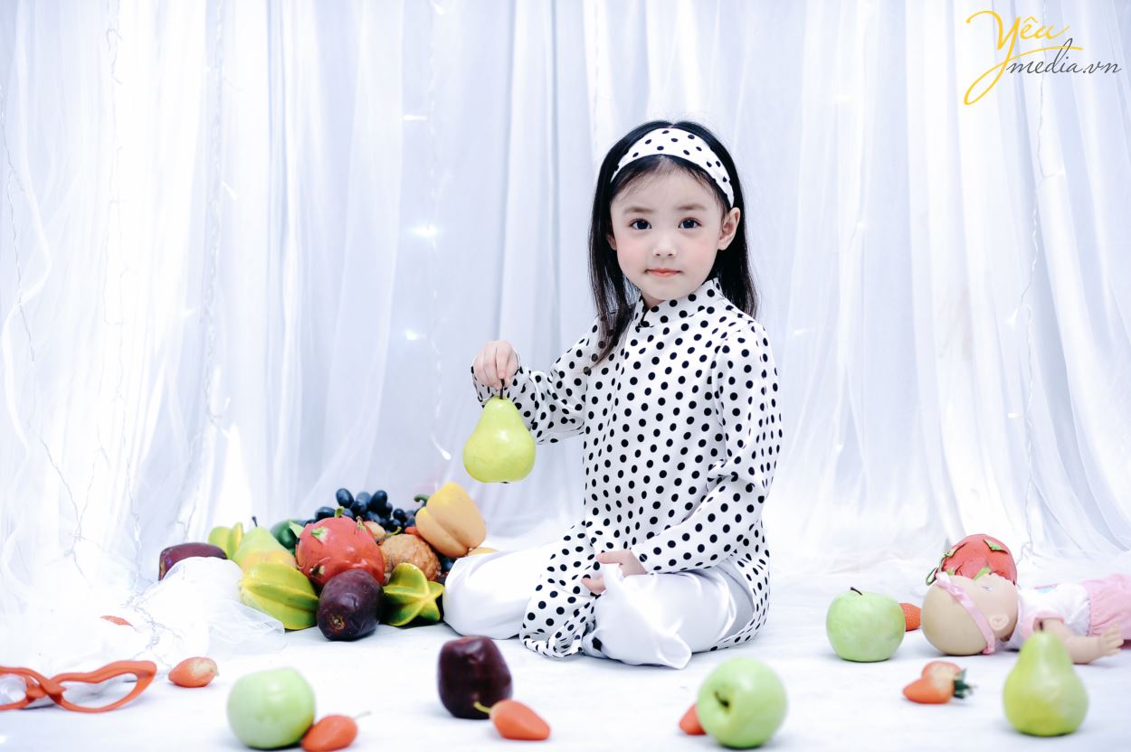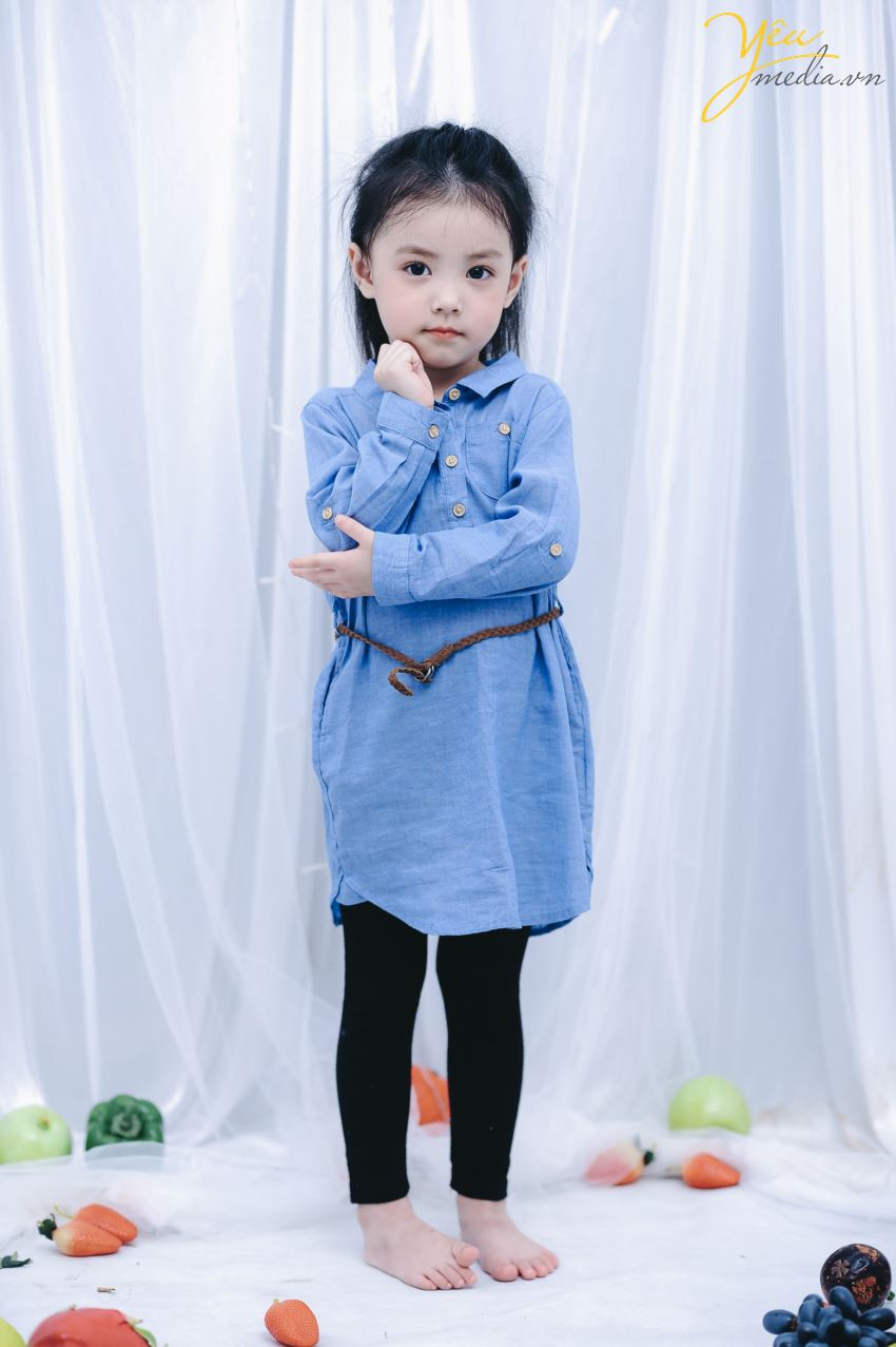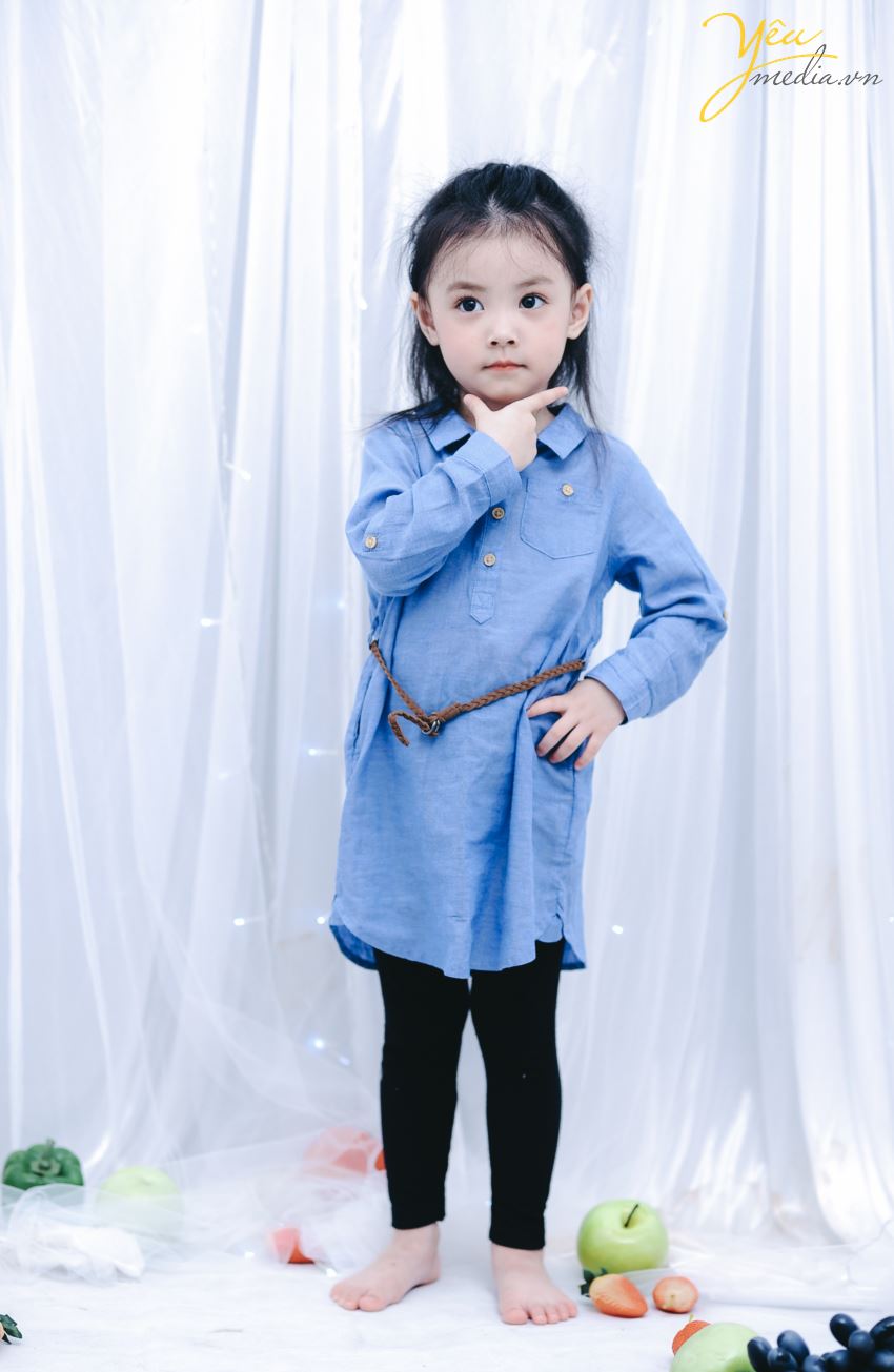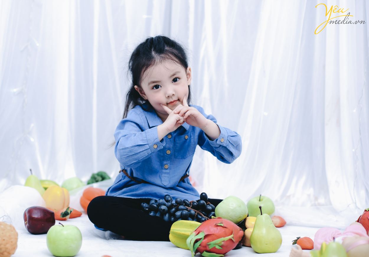 Không chỉ vậy, cả ekip chụp ảnh đều đặc biệt ấn tượng với cách biểu cảm và tạo dáng của cô bé. Sau mỗi lần thay đồ, bé lại chủ động biết tạo dáng để phù hợp với bộ ảnh. Bé cũng biết tương tác với các đạo cụ xung quanh như hoa quả và cành hoa một cách rất “chuyên nghiệp”.