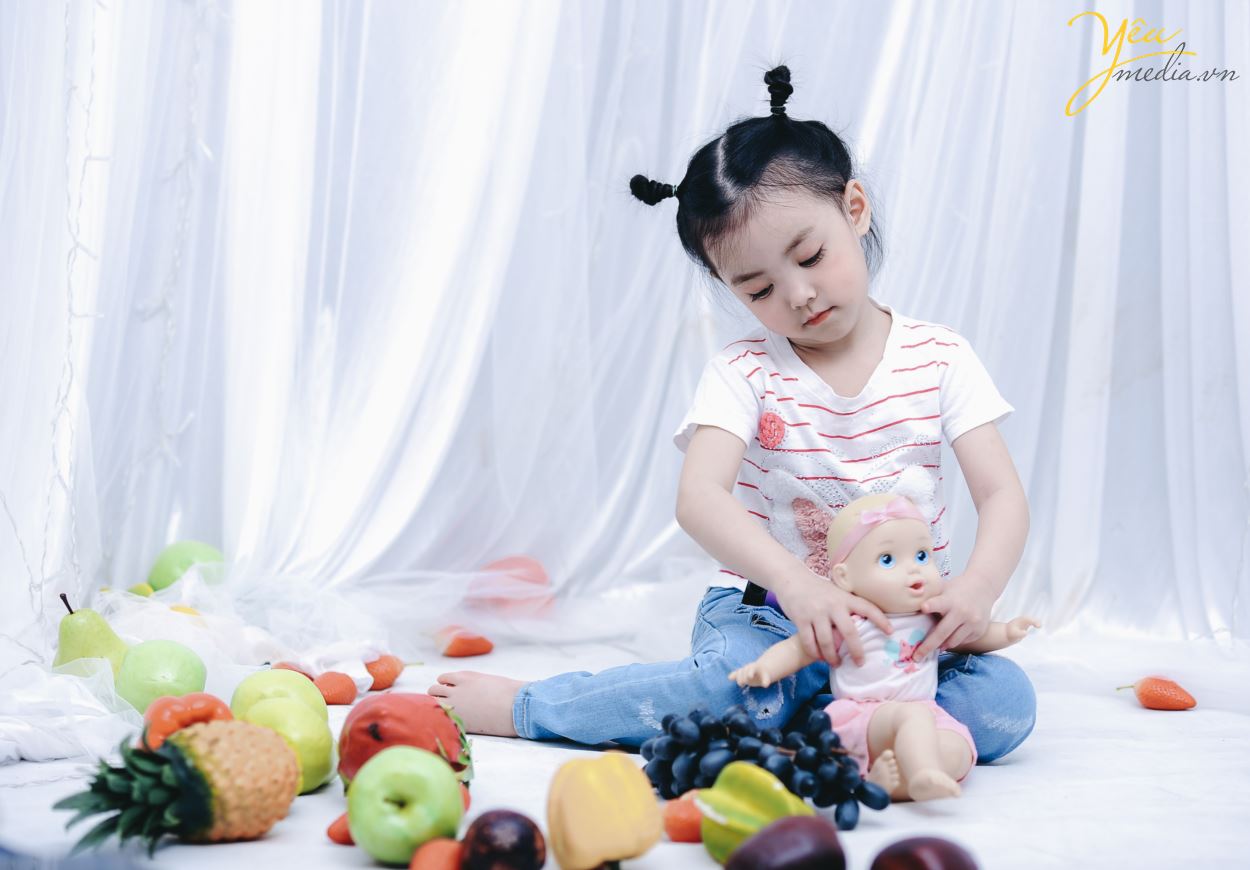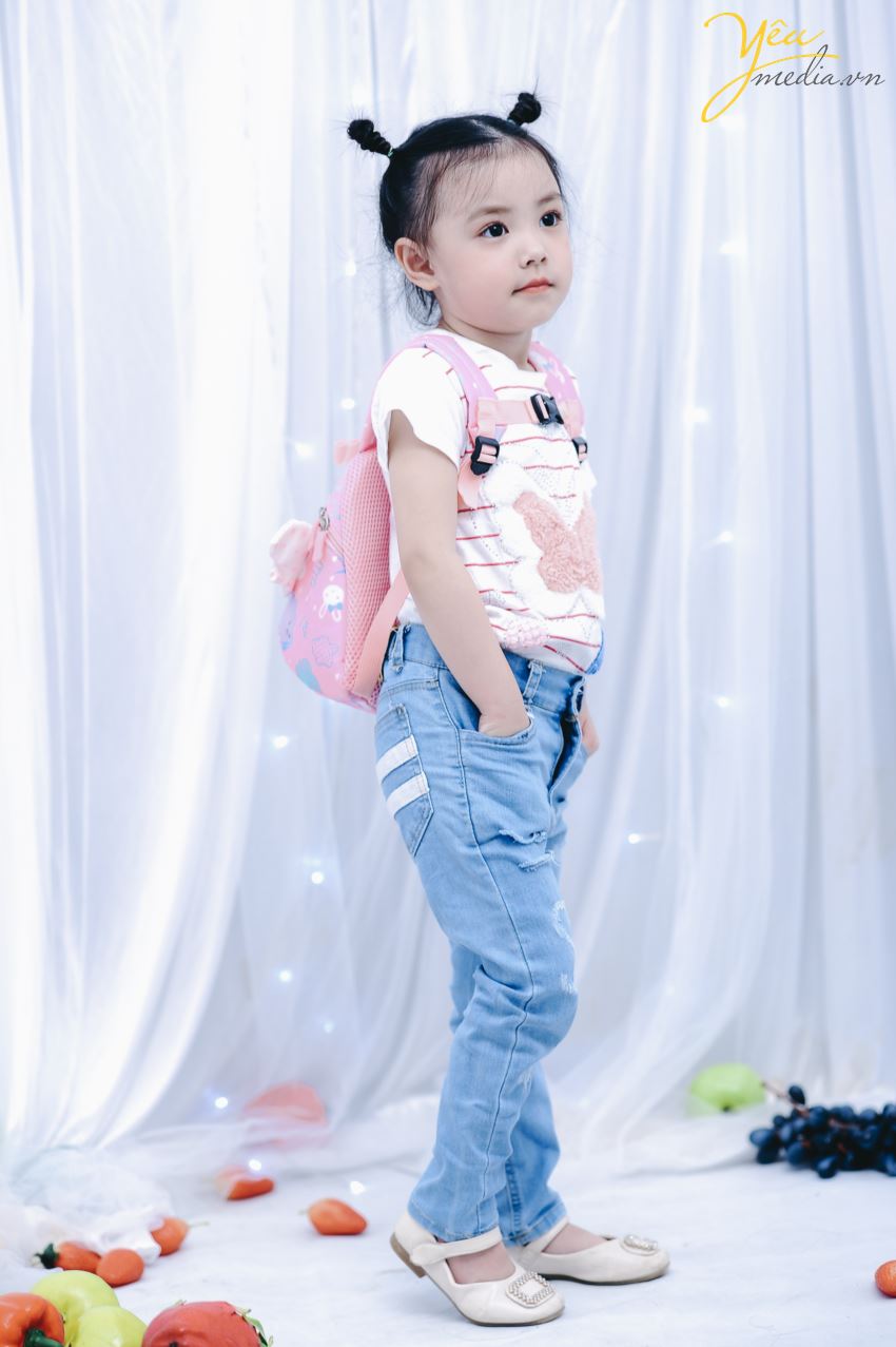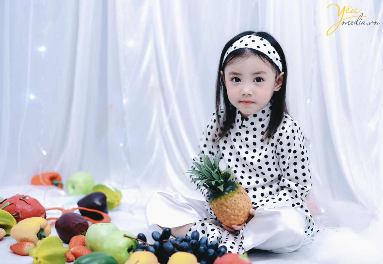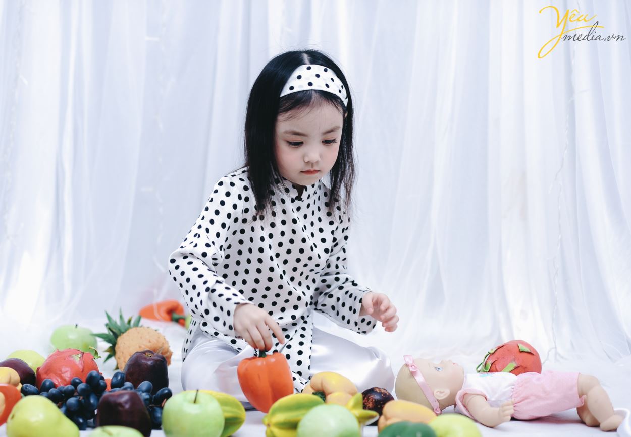Không chỉ vậy, cả ekip chụp ảnh đều đặc biệt ấn tượng với cách biểu cảm và tạo dáng của cô bé. Sau mỗi lần thay đồ, bé lại chủ động biết tạo dáng để phù hợp với bộ ảnh. Bé cũng biết tương tác với các đạo cụ xung quanh như hoa quả và cành hoa một cách rất “chuyên nghiệp”.