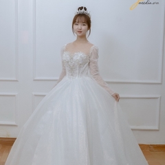 Váy cưới dáng xòe rộng, phù hợp với nhiều thân hình cô dâu, đặc biệt mẫu này tương đối rộng nên dành cho những cô dâu hơi mập một chút, tay dài nên sẽ che đc bắp tay và phần...