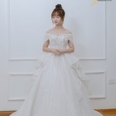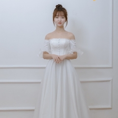 Váy cưới nhẹ nhàng, mềm mại, phù hợp mặc ngày đãi tiệc khách, thuận tiện cho việc đi lại hoặc chụp ảnh cưới trong studio phong cách đơn giản tự nhiên kiểu Hàn Quốc. Giá thuê: 1.200.000/ngày