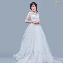Váy cưới Hilary từ Yêu Media có tay ren lãng mạn, tinh tế. Chất liệu ren cao cấp được lựa chọn kỹ lưỡng, hoa văn nhẹ nhàng, lãng mạn là điểm nhấn của toàn bộ chiếc váy cưới. Vải ren trong (thêu...