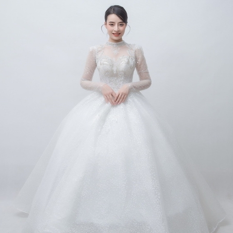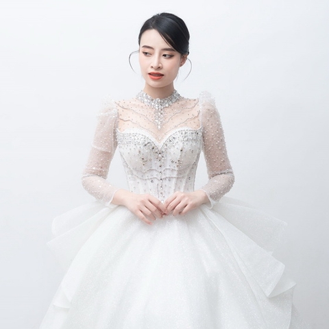 Váy cưới cao cổ, dài tay, đính đá phần thân trên sang trọng Giá thuê: 5.000.000