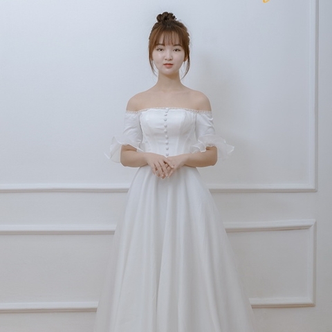 Váy cưới nhẹ nhàng, mềm mại, phù hợp mặc ngày đãi tiệc khách, thuận tiện cho việc đi lại hoặc chụp ảnh cưới trong studio phong cách đơn giản tự nhiên kiểu Hàn Quốc. Giá thuê: 1.200.000/ngày