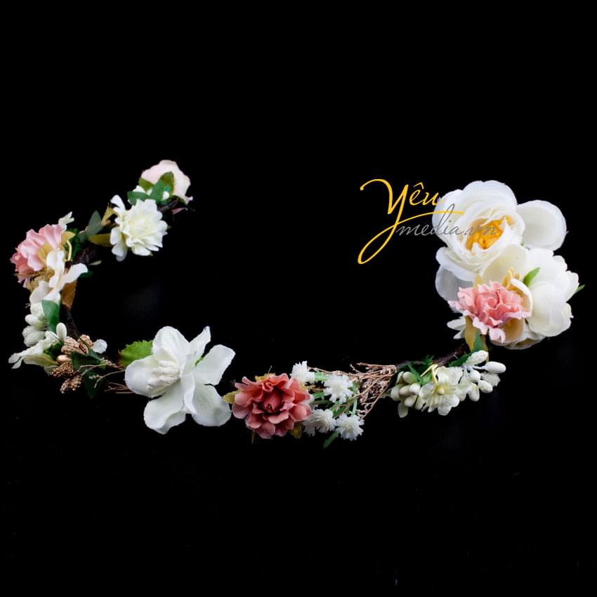 Hoa cài tóc cô dâu Floral 007 của Yêu Media là vòng hoa hở được kết từ những bông hoa vải với màu sắc nhẹ nhàng giúp cô dâu thêm phần nổi bật và đáng yêu.