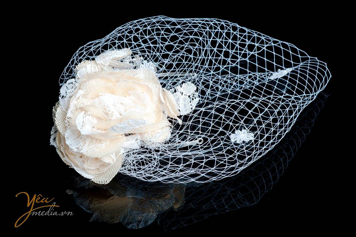 Có thể nói chiếc hoa cài tóc này được thiết kế đặc biệt nhất trong bộ sưu tập trang sức cô dâu của Yêu Media trong mùa cưới 2018. Chiếc hoa cài tóc gồm một bông hồng xinh xắn được làm bằng vải đăng ten màu kem, phần lưới trắng được đính những bông hoa nhỏ xinh vừa bớt nhàm chán và làm tăng sự dịu dàng. Phần hoa được gắn vào kim loại giúp đính vào tóc dễ dàng.