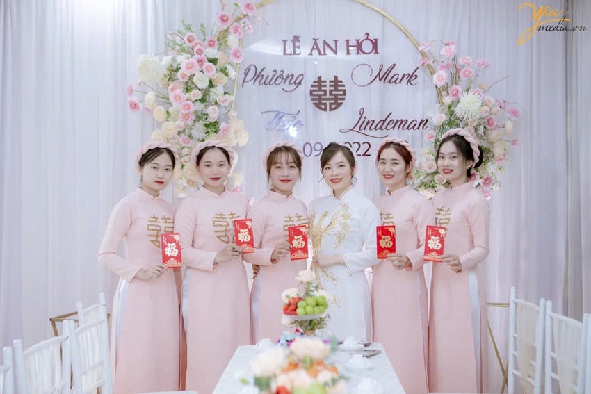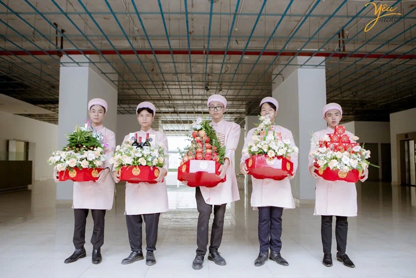 Đội hình bưng quả ở cả nhà trai và nhà gái nên lựa chọn những trang phục có màu sắc khác biệt so với cô dâu và chú rể để cặp đôi được trở nên nổi bật hơn.