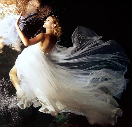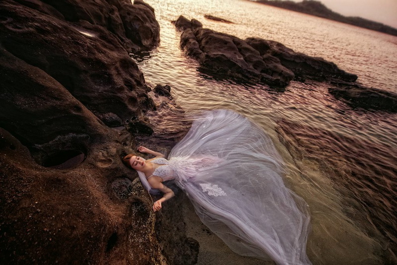 - Phong cách bay bổng, mộng mơ: Váy cưới bồng bềnh, nhẹ nhàng tung bay trong nước sẽ tạo cảm giác lãng mạn và huyền bí.