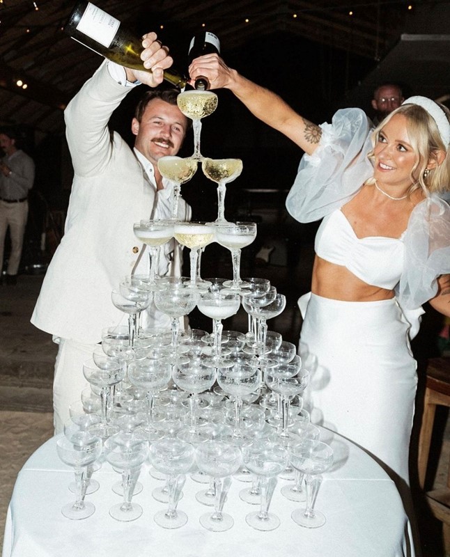 Nghi thức rót rượu vẫn luôn là phần để lại nhiều ấn tượng trong mỗi buổi tiệc, cô dâu - chú rể cùng nâng chai - rót rượu tạo hình ảnh tháp rượu chảy ảo diệu cực kỳ đẹp mắt. Để tiết kiệm chi phí, cặp đôi không cần phải cắt giảm phần này, chỉ cần thay rượu Champagne thành rượu vang, một loại rượu với hương vị ngọt, đắng, chát vừa đủ, dễ uống, giá cả lại phải chăng.