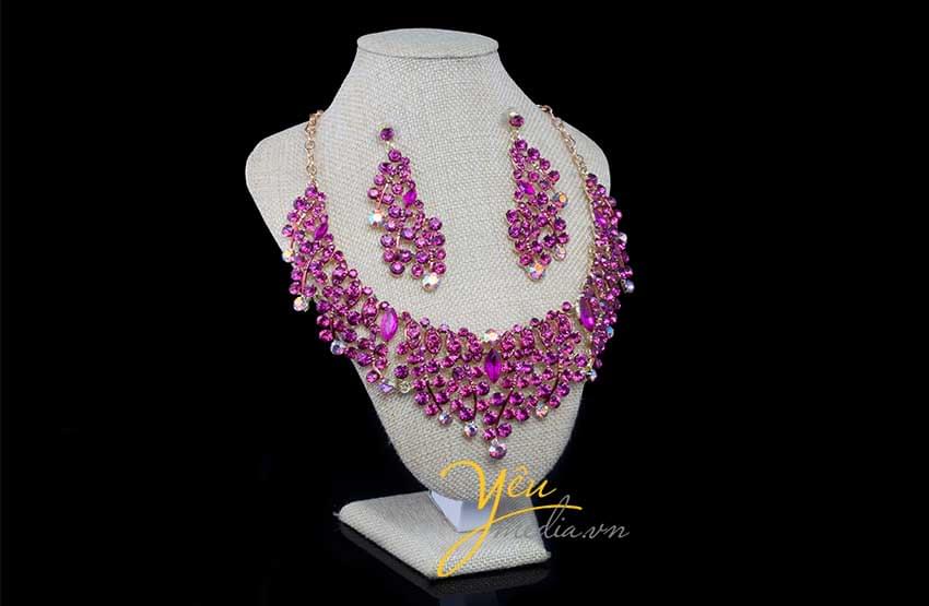 Bộ trang sức cô dâu Pretty Pink của Yêu Media với 1 dây chuyền, 1 đôi bông tai được thiết kế đính đá màu hồng tươi trẻ, nữ tính không kém phần sang trọng cho cô dâu trong ngày cưới cũng như đi chụp ảnh cưới. Với giá thuê thấp chỉ 100.000đ sẽ giúp cô dâu chú rể giảm thiểu chi phí cưới rất nhiều so với việc đi mua 1 bộ trang sức cưới.