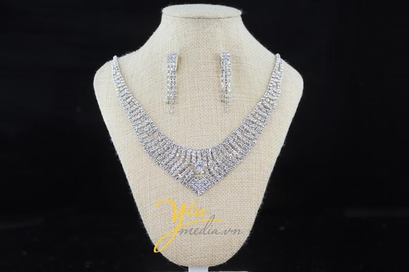 Mùa xuân là mùa cây lá đâm chồi nảy lộc, cho người ta cảm giác ấm áp, tươi vui. Lấy cảm hứng từ sự tươi mới của sắc xuân bộ trang sức cô dâu Spring Time của Yêu Media gồm 1 vòng cổ và 1 đôi bông tai được đính pha lê lấp lánh giúp cô dâu thêm phần nổi bật và lộng lẫy.