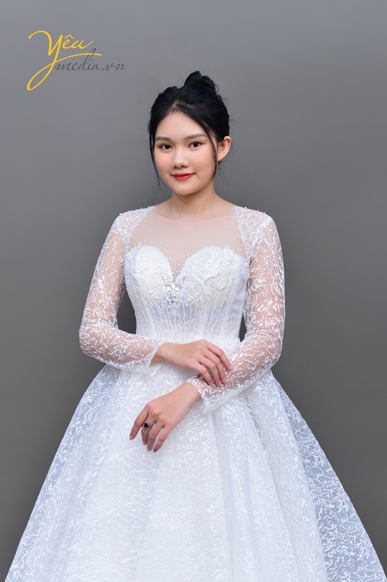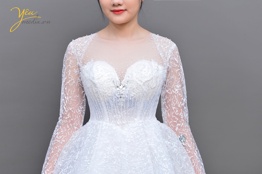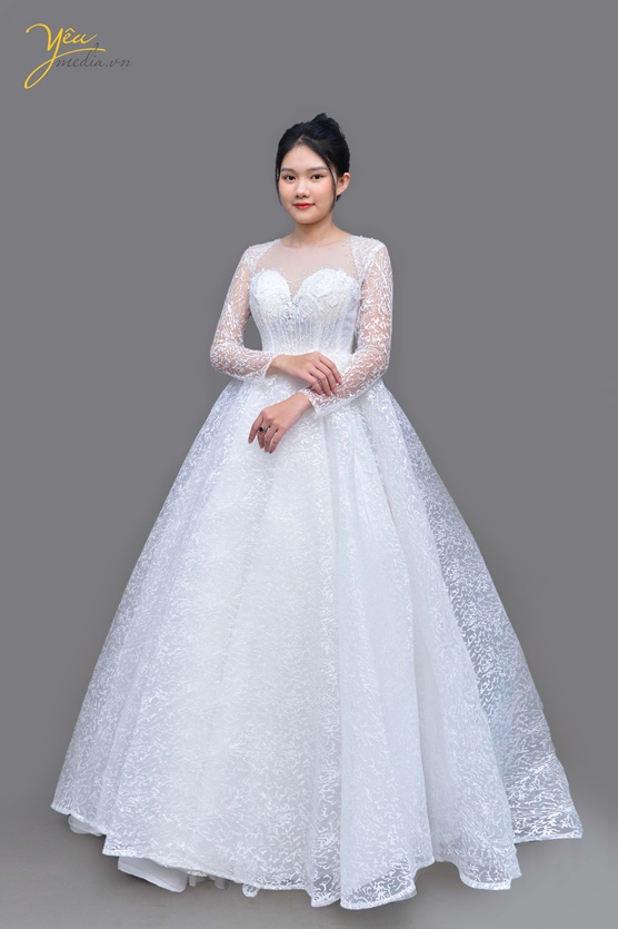Váy cưới dài tay giúp cánh tay thon gọn, dáng váy dài xòe bồng bềnh phù hợp với mọi dáng người